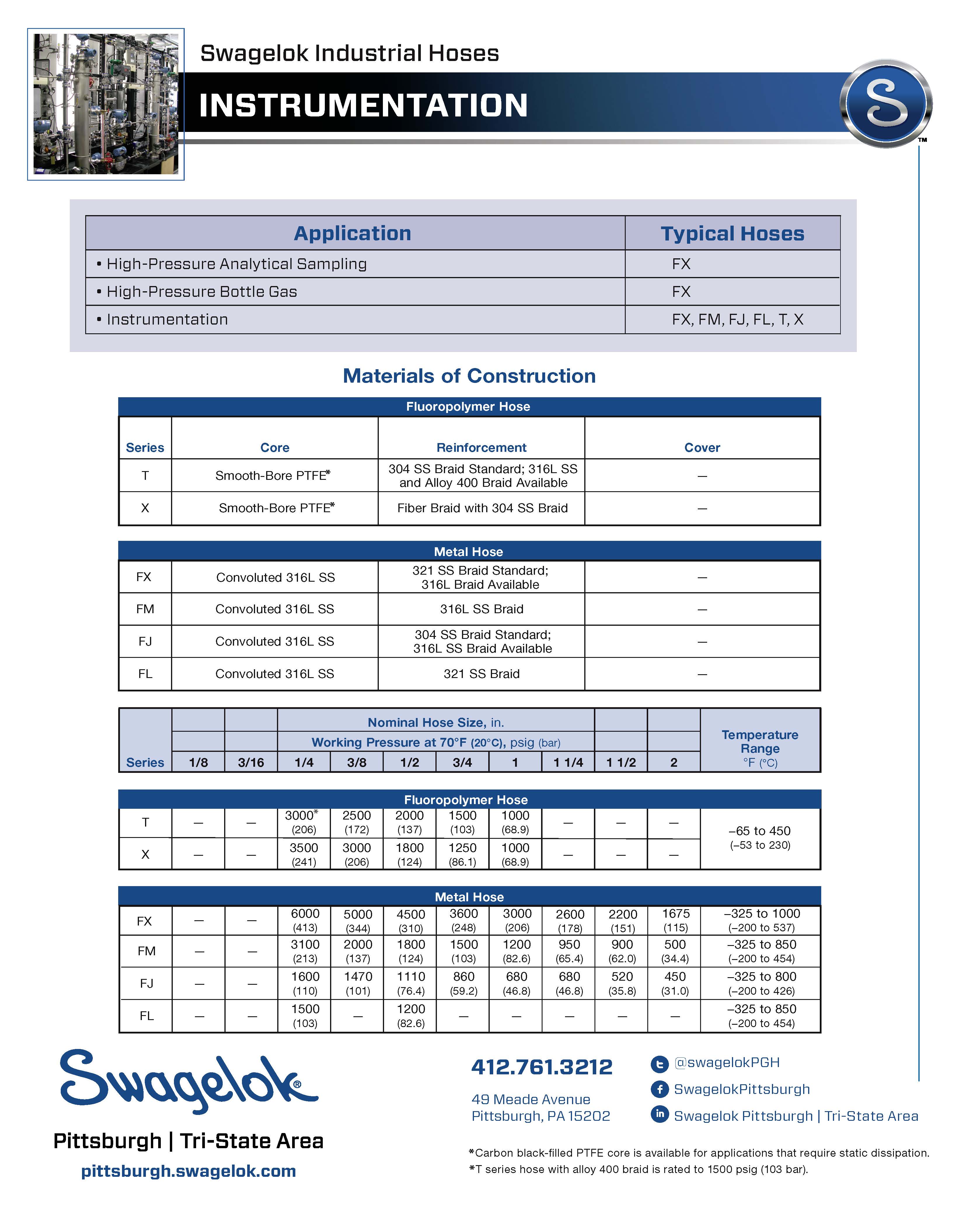 Flexible Hose means fewer connections….and fewer connections mean a safer, easier-to-clean fluid system with far less leakage, maintenance, and labor. All Swagelok Hoses are assembled by certified Swagelok technicians, according to controlled standard work documents, on robust and 100%-accurate equipment. We test all our Hoses to validate Room Temperature Burst, Static Bend Radius, Dynamic Bend Radius, Permeation, Hot/Cold Elevated Temperature Burst, and Vacuum. Swagelok® ultra-durable industrial Hoses are available for temperature ranges from -325º F to 1000º F, for working pressures up to 6000 psi, in sizes 1/8” to 2”, in four basic core types: all-metal, fluoropolymer, thermoplastic, and rubber. All styles are offered in custom lengths and with your choice of 11 different end connections, six covers, and four tags.