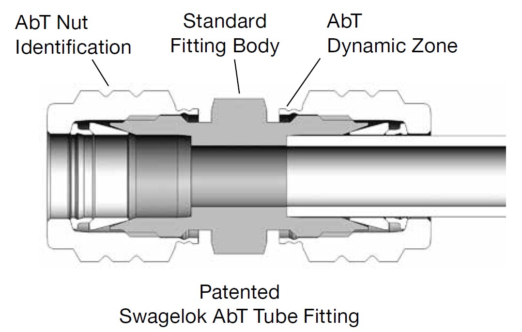 อุปกรณ์ต่อท่อ AbT ของสเวจล็อค ใช้คุณสมบัติการหยุดเฉพาะที่เรียกว่าโซนไดนามิก (จดสิทธิบัตรแล้ว) ซึ่งผสานเข้ากับอุปกรณ์ต่อท่อสเวจล็อค ที่น่าเชื่อถือสูงและใช้งานกันอย่างแพร่หลาย การออกแบบในทุกขนาดจะควบคุมการเคลื่อนที่ตามแนวแกนของน็อตในระหว่างการประกอบและถอดประกอบ