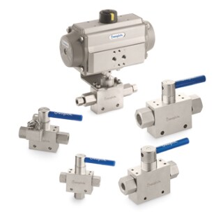 บอลวาล์วแบบสำหรับงานแรงดันปานกลาง พร้อมปลายต่อแบบ Swagelok FK Medium-Pressure Tube Fitting รองรับแรงดันสูงสุดถึง 20,000 psig รองรับทั้งแบบ 2 ทาง และ 3 ทาง พร้อมตัวเลือกแอคชูเอเตอร์ที่หลากหลายสำหรับการใช้งานในระบบอัตโนมัติ